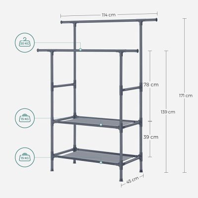 • Ruhaállvány 2 tárolópolccal, szobainas 114 x 171 x 45 cm, szürke