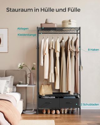Ruhatartó állvány, nyitott ruhásszekrény, fogas rácspolcokkal, ruhatartó állvány 2 fiókkal és ruharúddal, szabadon álló, tintafekete