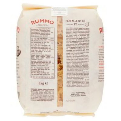 Rummo N.85 Farfalle tészta, 1 kg, Kiváló minőségű durumbúzából készült, magas glutén- és fehérjetartalommal. Elkészítés: Forrásban lévő vízben 12 percig főzzük. Nyomokban szóját tartalmazhat.Tápanyag információ (100gr): Energia: 356 kcal, Zsír: 1,6 g -ebből telített zsírsavak 0,3 g, Szénhidrát 69,5 g, amelyből cukor 3,1 g, Fehérje 14,5 g, Só 0,01 g. Minőségét megőrzi: a csomagoláson feltüntetett időpontig (nap/hó/év). Származási ország: Olaszország. Forgalmazó: Milis Faplusz Kft 8092 Pátka Gárdonyi u.36.