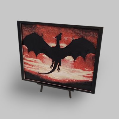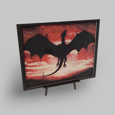 Ez a Hueforge technikával készült kép különleges látványvilágot nyújt anélkül, hogy világításra lenne szüksége. A háttér lávaként izzó égboltja és a fekete, karakteres sárkányformája együtt drámai és stílusos összhatást keltenek.