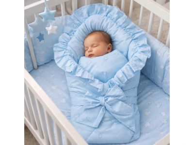 A Scarlett MÉĎA pólya - kék színű - egy puha és kényelmes pólya, finom anyagokból, amely segít a babának biztonságban és nyugodtan érezni magát alvás és pihenés közben.
