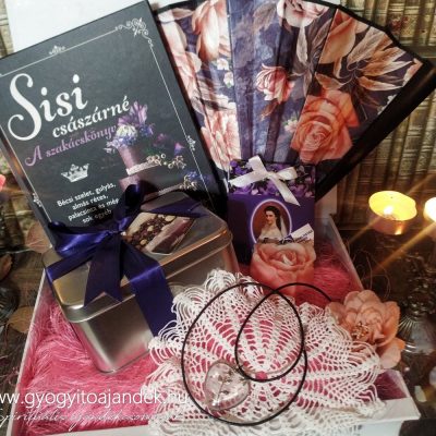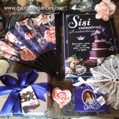 Sisi ajándékcsomag, nem csak Sisi-rajongóknak! Hanem minden kedves hölgynek, aki szereti a romantikus vintage jellegű meglepetéseket. Sisi minden idők egyik legnépszerűbb történelmi alakja, az őt övező Sisi-kultusz a mai napig virágzik. Ruhatára, budoárjának részei, egyéb relikviái máig nagy érdeklődésnek örvendenek, bárhol is készül kiállítás belőlük. Az ibolya és az édességek iránti rajongása is köztudott és számos alkotót ihletett meg. Ebben az ajándékboxban megtalálható egy csodás fotókkal illusztrált szakácskönyv, benne a császárné kedvenc fogásaival. Szépségére emlékeztet egy vintage stílusú ibolya lila rózsás legyező, mely a könyv mellett exkluzív és maradandó emlék csakúgy mint egy antik rózsát ábrázoló hegyikristály szív medál. A császárné kedvenc virága az ibolya volt így nem maradhat el az ikonikus kandirozott ibolya sem a csomagból, melyet mindenkinek legalább egyszer meg kell kóstolnia! Mindezt egy könyv alakú díszdobozban kínáljuk.