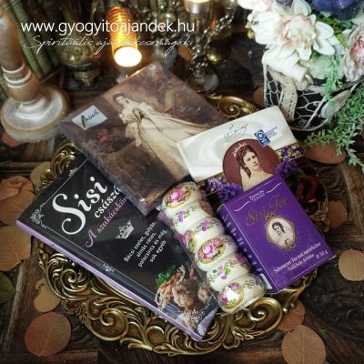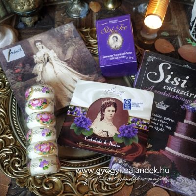 Sisi ajándékcsomag, nem csak Sisi-rajongóknak! Hanem minden kedves hölgynek, aki szereti a romantikus vintage jellegű meglepetéseket. Sisi minden idők egyik legnépszerűbb történelmi alakja, az őt övező Sisi-kultusz a mai napig virágzik. Ruhatára, budoájának részei, egyéb relikviái máig nagy érdeklődésnek örvendenek, bárhol is készül kiállítás belőlük. Az ibolya és az édességek iránti rajongása is köztudott és számos alkotót ihletett meg. Ebben az ajándékboxban megtalálható egy csodás fotókkal illusztrált szakácskönyv, benne a császárné kedvenc fogásaival (köztük az ibolyás fagylalt). Ha pedig Sissihez kapcsolódó konyhaművészetről van szó, nem feledkezhetünk meg a fenséges terítékről, melyhez mi adjuk a kézzel festett szalvétagyűrűket és Sissi szalvétákat. Nem maradhat el az ikonikus ibolyás csokoládé és ibolya ízesítésű fekete tea sem a csomagból, melyet mindenkinek legalább egyszer meg kell kóstolnia!