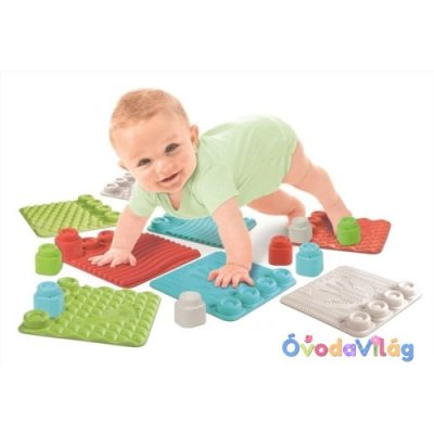 Az érzékfejlesztő játszószőnyeg építőkockákkal szettben egy különleges, 8 darabból álló, különböző színű puha szőnyeglap található meg, melyek különböző felületűek is.
