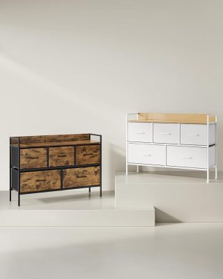 Ez a SONGMICS fiókos szekrény a funkcionalitás és az esztétikum tökéletes kombinációja. A rusztikus barna felületek és a fekete fém váz industrial stílust kölcsönöz a bútornak, míg az 5 fiók praktikus tárolási megoldást kínál. A három kisebb és két nagyobb fiók lehetővé teszi a különböző méretű ruhák és kiegészítők rendszerezett tárolását.