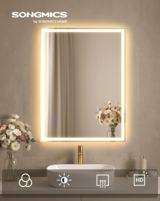 • SONGMICS LED-es fürdőszobai tükör, 71x51 cm, páramentesítő funkció, fehér