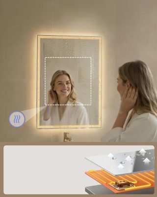 • Páramentesítő funkció, mindig tiszta kép: Az érintőgombbal vezérelhető páramentesítő funkció felmelegíti a tükör felületét, hogy megakadályozza a kondenzációt és tisztán tartsa azt, ami ideális a fürdőszobai használathoz