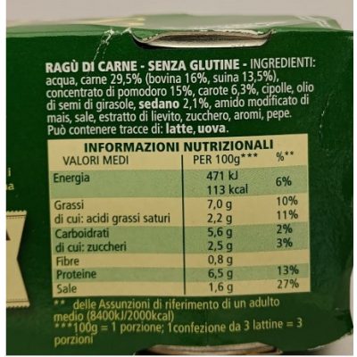 Star ragu, húsos 100X3. Összetevők : Víz, hús 29,5% (marhahús 16%, sertéshús 13,5%), paradicsompüré 15%, sárgarépa 6,3%, hagyma, napraforgóolaj, zeller 2,1%, módosított kukoricakeményítő, élesztőkivonat, aromák, bors, Tartalmazhat nyomokban: tejet, halat, tojást. Átlagos tápérték 100 g termékben: Energia 473 kj , (113 kcal) , Zsír 7 g , Telített zsír 2,2 g , Szénhidrát 5,6 g , Cukor 2,5 g , Fehérjék 6,5 g , Só 1,6 g .Minőségét megőrzi: a csomagoláson feltüntetett időpontig (nap/hó/év). Tárolás: Hűvös, száraz, helyen tartandó. Származási ország: Olaszország.Forgalmazó: Milis Faplusz Kft 8092 Pátka Gárdonyi u.36