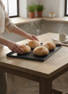 • Egyenletes hőeloszlás: A sütőtálca egyenletes hőelosztást biztosít, így a sütemények mindenhol egyenletesen sülnek meg. Ez megakadályozza, hogy a sütemények egyik oldala megégjen, míg a másik oldala nyers marad.