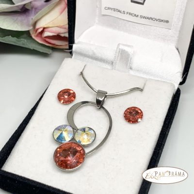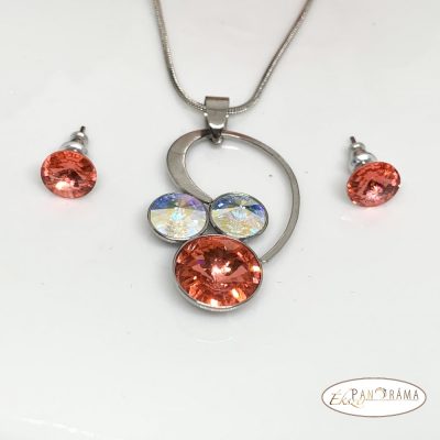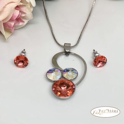 Eredeti swanis kristállyal díszített ékszer szett, amihez eredeti swanis kristály fülbevaló, és nemesacél nyaklánc tartozik egy gyönyörű különleges formájú medállal, amiben 2 db 9 mm és egy 12 mm-es káprázatos ragyogású kristály csillog. Több színben is kapható.