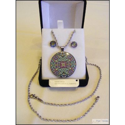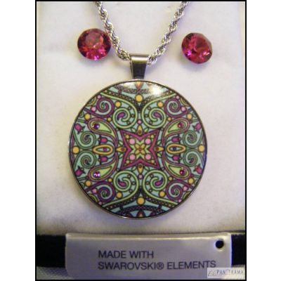 Eredeti swaro kristállyal díszített tűzzománc jellegű ékszer szett, amihez eredeti swaro kristály fülbevaló, és nemesacél nyaklánc tartozik egy gyönyörű vintage mintás tűzzománc jellegű medállal, amiben 4 pici pink színű swarovszki kristály csillog.