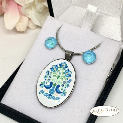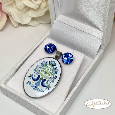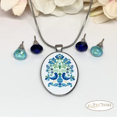 Eredeti kristállyal díszített tűzzománc jellegű ékszer szett, amihez két pár eredeti kristály fülbevaló, és nemesacél nyaklánc tartozik egy gyönyörű vintage mintás tűzzománc jellegű medállal, amiben 4 pici kristály csillog.