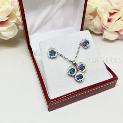 Gyönyörűen csillogó AB kristályokkal díszített fülbevaló és medálos nyaklánc szett orvosi acéllal! Kristály szögletes