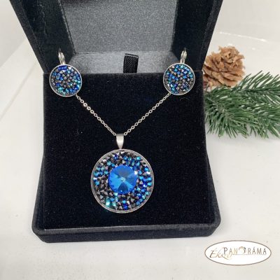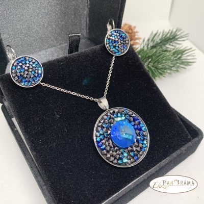 Nyaklánc mérete 45-50 cm , fülbevaló francia kapcsos, apró blue mix kristályos, átmérő 16 mm, teljes hossza 24mm, medál átmérője 30 mm