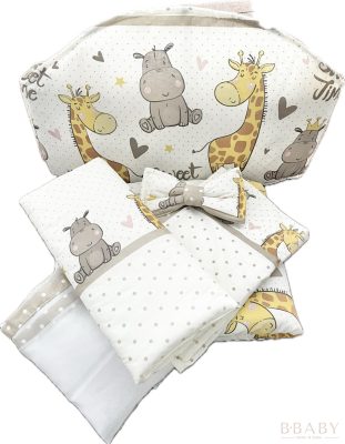 Sweet Time bézs – boldog bébi zsiráf és víziló mintás 4 részes babaágynemű szett