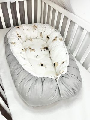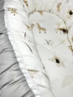 Szafari álom babafészek – kétoldalas pamut fészek szürke és szafari mintával