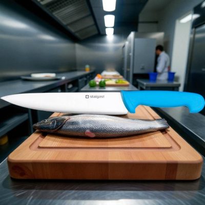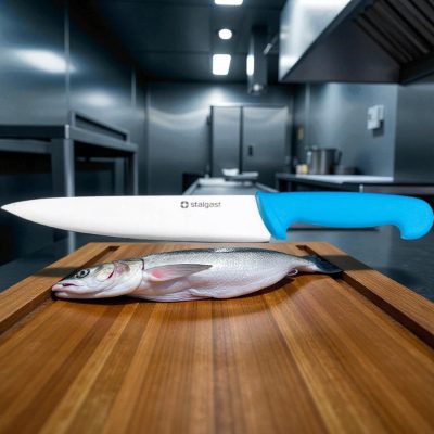 • Kék, ergonomikus nyél (HACCP színkód): A kék nyél egyértelműen jelzi a kés felhasználási területét (halak és tenger gyümölcsei), ezzel segítve a HACCP protokoll betartását a konyhában. Az ergonomikus kialakítás kényelmes és biztonságos fogást biztosít, csökkentve a kéz fáradtságát hosszabb ideig tartó használat esetén is. A nyél anyaga tartós, könnyen tisztítható és fertőtleníthető műanyag (érdemes megadni a pontos anyagot, pl. polipropilén, TPE). A sima, hézagmentes felület megakadályozza a szennyeződések megtapadását.