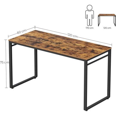 számítógépes asztal, íróasztal, otthoni irodai íróasztal 8 kampóval, 120 x 60 x 75 cm, dolgozószobához és hálószobához, könnyen összeszerelhető, acél, ipari kivitel, rusztikus barna és fekete: