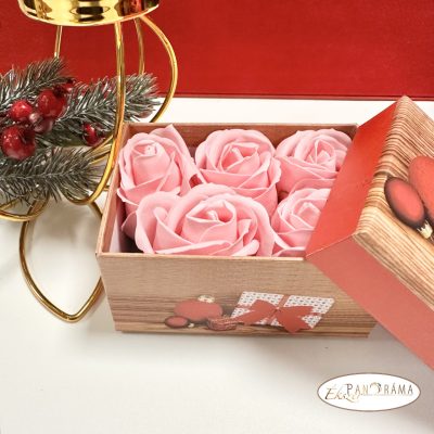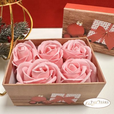 Karácsonyi mintázatú díszdobozban 5db csodás illatú 5 cm-es szappan rózsa