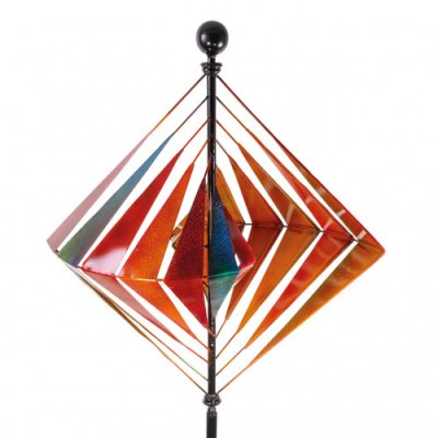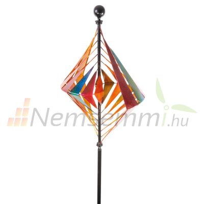A fém, szivárványszínű kivitelű, ívelt lamellák mozgás közben rendkívüli optikai 3D hatást keltenek a szélforgóban. 215 cm-es teljes magasságú, a színezés is abszolút szemet gyönyörködtető, a lécek finoman csillognak a fényben.
