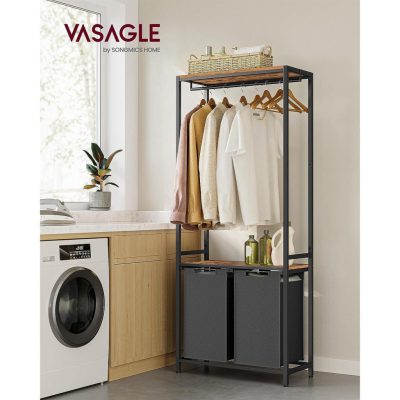 szennyeskosár, 2 részes ruhatartó 2 polccal, kihúzható és kivehető béléssel, ruhatartó sín, 2 x 46 l, 73 x 33 x 177 cm, rusztikus barna és fekete: