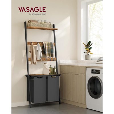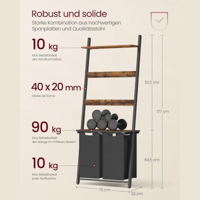 Szennyeskosár törülköző létrával, törülközőtartó ruhatartóval, 73 x 177 x 33 cm, törölközőtartó, szennyesválogató 2 rekeszes, létrapolc, fürdőszobabútor, rusztikus barna/fekete: