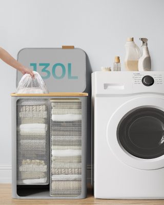 Ez a 130L-es szennyeskosár (52 × 38,5 × 70,5 cm) két külön rekesszel rendelkezik, így tökéletes választás egy háromfős háztartás számára. Segít a ruhák rendszerezésében, megkönnyítve ezzel a mosási rutint.