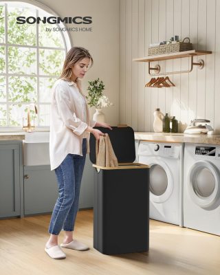 Szennyeskosár fedéllel, 90 L-es szennyestartó, kivehető szennyestáska, Oxford szövet, bambusz fogantyúk, összecsukható, 42 x 32 x 70,5 cm, tintafekete