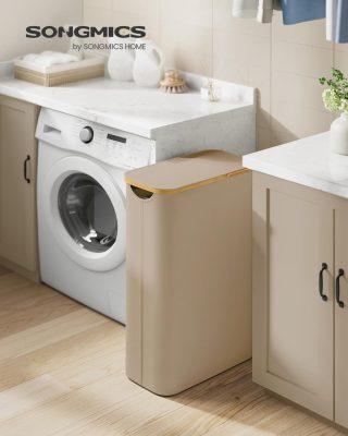 SONGMICS Szennyeskosár fedővel, keskeny szennyes tároló, 65 L, helytakarékos, levehető hálós bélés, Oxford szövet, bambusz fogantyúk, összecsukható, 42 x 22,5 x 70,5 cm, Tevebarna
