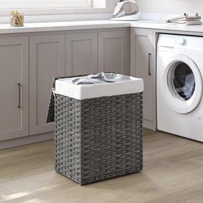 kézi szövésű mosodai kosár, 90 literes szintetikus rattan ruhatartó fedéllel és fogantyúkkal, összecsukható, kivehető béléstáska, szürke