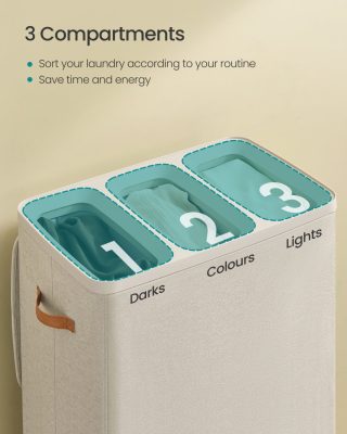 • Praktikus a ruhák szortírozásához: A 3 rekesz segítségével könnyedén elkülöníthetők a sötét, világos és színes ruhák.