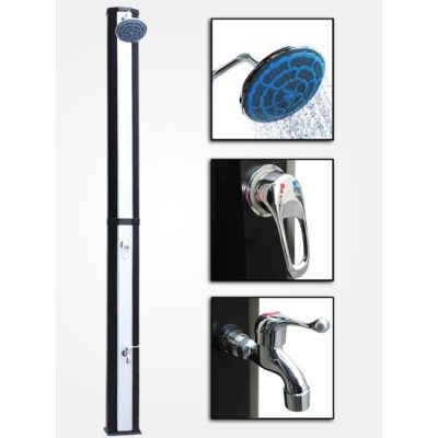 • Szétszedhető kerti zuhanyzó 35 literes szolár zuhanyzó lábmosó csappal. Elegáns, ezüst csíkkal, kis szállítási és tárolási mérettel 2 év garanciával.