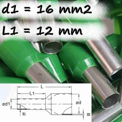 A 16 mm² keresztmetszetű vezetékekhez tervezett hüvely 12 mm-es fémhüvely-hosszal (L1) rendelkezik, amely elegendő krimpelési felületet biztosít az erős, mechanikailag stabil kötéshez. A teljes hossz 24 mm, így kompakt kialakítása mellett jól illeszkedik a legtöbb elosztó- és vezérlőszekrénybe.