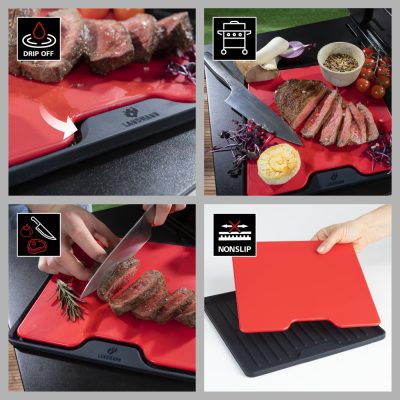Összességében a Landmann szilikon lap vágódeszkával egy praktikus és sokoldalú konyhai kiegészítő, amely megkönnyíti az ételek előkészítését és tálalását. Az eszköz kiváló minőségű szilikonból készült, rugalmas és hajlékony, és könnyen tisztítható. A deszka méretei praktikusak és kényelmesek, és használható vágódeszkaként és tálalóeszközként is.