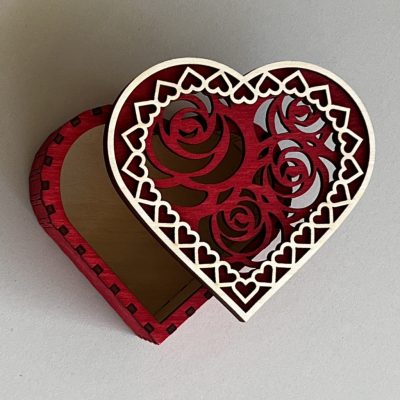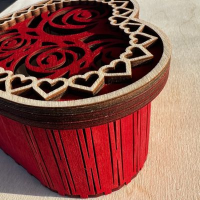 Elegáns, szív formájú fa díszdoboz finom lézervágott rózsamintával és szíves peremmel. Piros pácolásával egy határozott Valentin-napi gesztussá teszi a benne rejlő apróságot, édességet, vagy üzenetet.