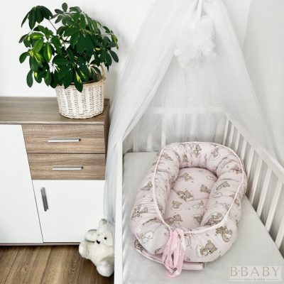 Szivárványos Álom – Babafészek újszülötteknek | Alvó mackóval, rózsaszín minta, 100% pamut, antiallergén, mosható