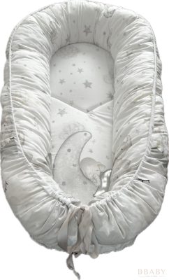 Ez a babafészek a skandináv stílus minimalizmusát és a babák igényeire szabott funkcionalitást ötvözi. A szűkített, ölelő kialakítás biztonságérzetet nyújt, visszaidézve a pocakban töltött idő nyugalmát. A 100% pamutvászon huzat természetes és bőrbarát, míg a töltet antiallergén vatelin és kényelmes szivacs, így maximális komfortot és védelmet nyújt.