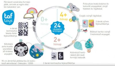 Újszülött kortól ajánlott, gazdagon felszerelt játék karika, különféle fejlődési stádiumhoz.