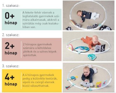 - 4 hónapos gyermekek számára különféle textúrák, sípoló és csörgő elemek.