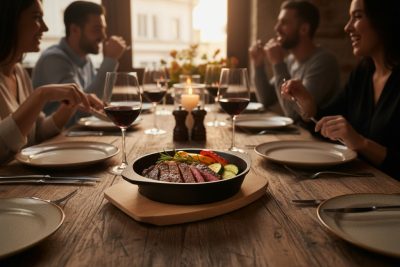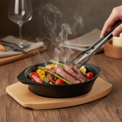 A mellékelt fa alátét megvédi az asztalfelületet a hőtől, miközben természetes, rusztikus megjelenést ad a tálalásnak. A fa és az öntöttvas kombinációja kifejezetten kedvelt bisztrókban, steakhouse-okban és street food helyeken.