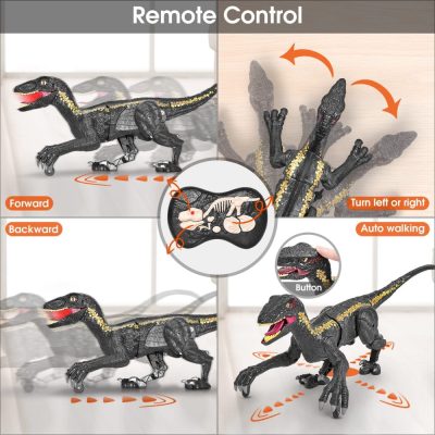 A dinoszaurusz világos fekete arany színben. Bármely testrészét képes mozgatni (áll, nyak, derék, farok). Nyomd meg a fej gombot a távirányító dinoszauruszának vezérléséhez, hogy előre/hátra mozogjon, és nyomd meg a lábgombot a sétáló raptor balra/jobbra fordulásához. Nyomd meg az "ONE-KEY DEMO" gombot, hogy a dinoszaurusz egy akciócsoportot mutasson be a gyereknek, farkcsóválva, ordítva, előre/hátra és jobbra/balra fordul. Minden viselkedés életszerű.
