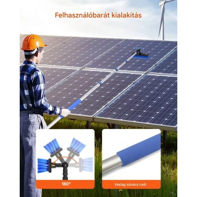 • Teleszkópos mosókefe 11 m hosszúságig kihúzható nyéllel és 20 m tömlővel 180 fokban állítható fejjel napelemek és kültéri felületek tisztításához