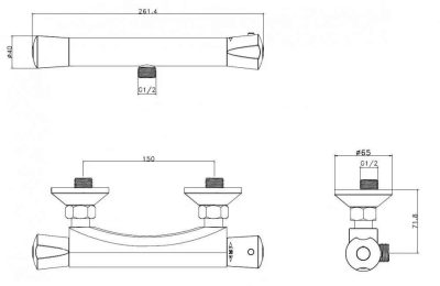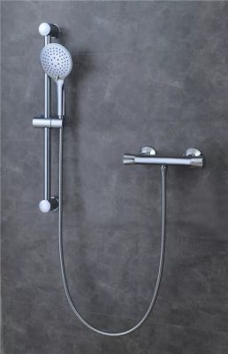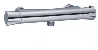 Termosztátos zuhany csaptelep, króm színű, sárgaréz övözet, egykaros, fali csaptelep.