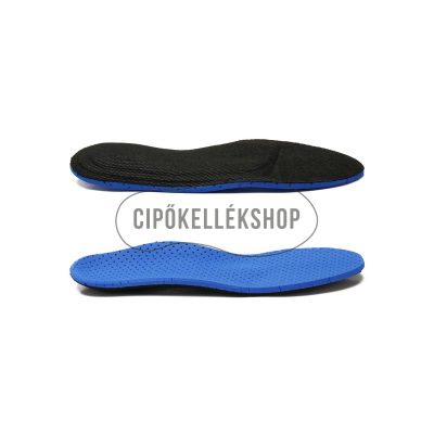 Thermoplasztikus lúdtalpbetét, fedőrétege perforált kék színű EVA 3/5 mm, alja megerősített merevített műanyag fekete záró réteg.