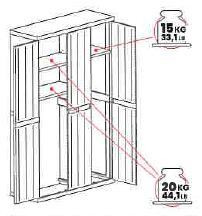 A szekrény három állítható polccal van felszerelve, szélesebb kettő egyenként akár 20 kg súlyú, a harmadik (a szekrény keskenyebb részében) pedig 15 kg súlyú szerszámok tárolására alkalmas, így lehetőség nyílik a belső tér rugalmas kialakítására az egyéni igények szerint.