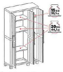 A szekrény négy állítható polccal van felszerelve. A szélesebb három egyenként akár 20 kg-ot, a negyedik, a szekrény keskenyebb részében 15 kg szerszámot és munkasegédet tud elhelyezni. Lehetőséget ad arra, hogy a belső teret rugalmasan, egyéni igényeknek megfelelően rendezze be. A szekrény keskenyebb része például egy seprű vagy más hosszabb szerszám tárolására alkalmas.