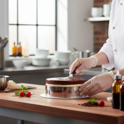A de Buyer 26 cm-es tortakarika professzionális cukrászati eszköz torták, mousse desszertek és réteges sütemények készítéséhez. A 6 cm magas egyenes fal stabil formát biztosít az összeállítás során.