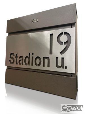Rozsdamentes dekor csíkkal díszített, fekvő kivitel, melyre opcionálisan házszám, utcanév, lézervágható.