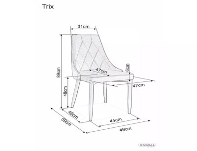 A Trix B étkezőszék a modern design és a klasszikus kényelem tökéletes ötvözete. A tengerészkék bársony kárpitozás elegáns rombusz mintázattal párosul, amely különleges megjelenést kölcsönöz a széknek. A matt fekete fémlábak stabil alapot biztosítanak, miközben karcsú megjelenésükkel könnyedséget sugároznak. A szék háttámlája ergonomikusan kialakított, biztosítva a megfelelő tartást és kényelmet.