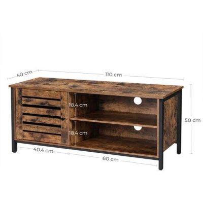 TV-szekrény 50 hüvelykes TV-hez, TV-konzol, TV-állvány, szekrény zsaluajtóval, 2 polc, nappali, hálószoba, ipari, rusztikus barna és fekete